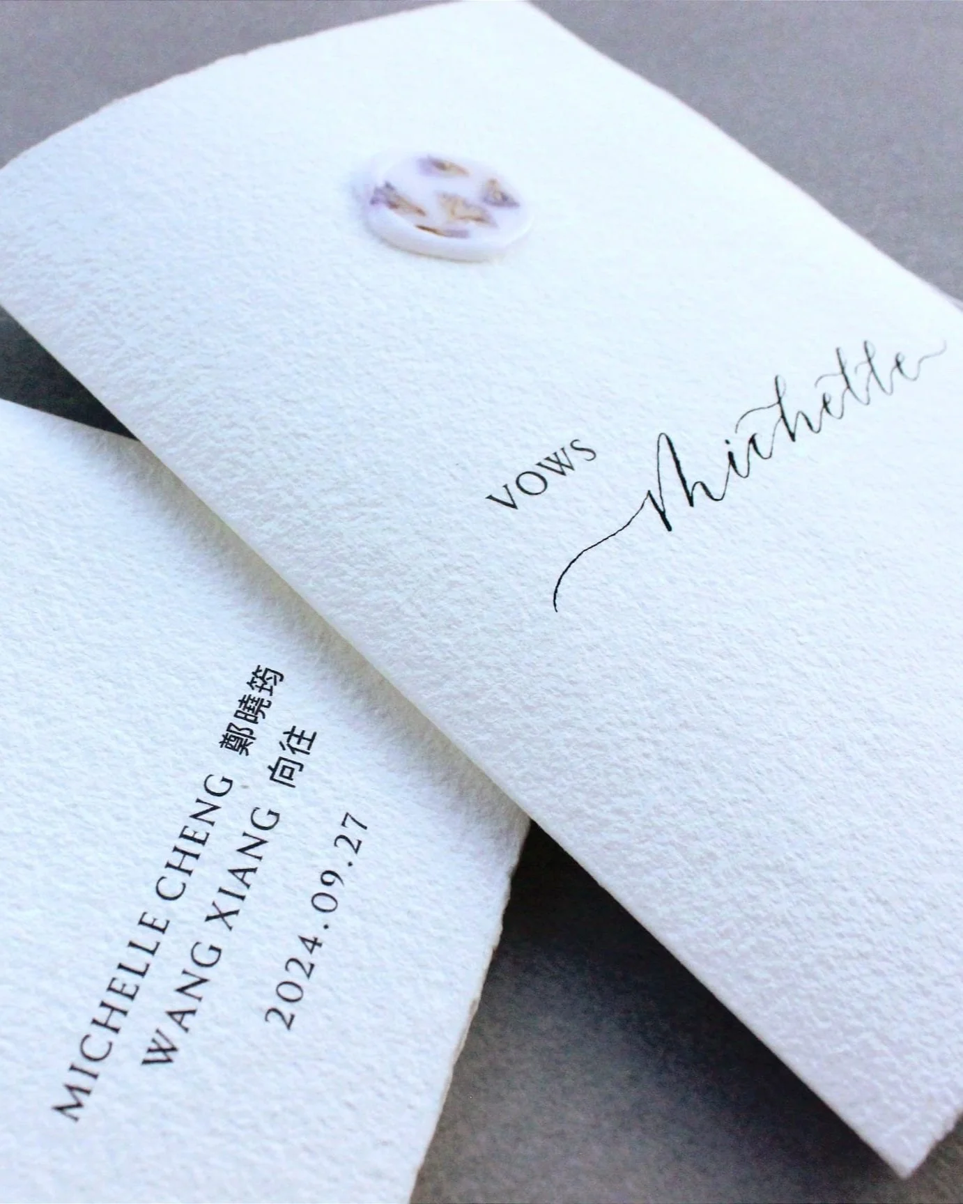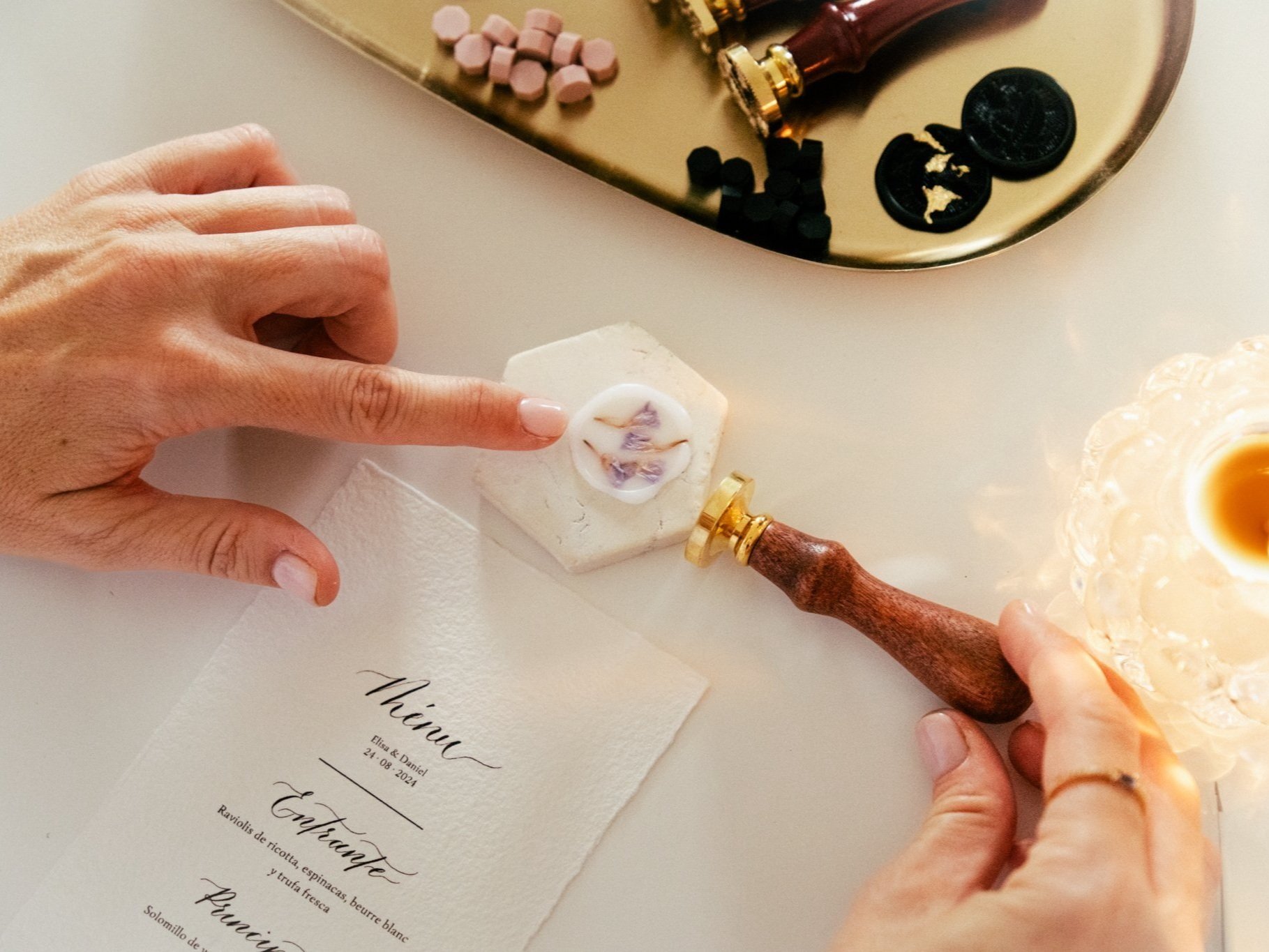 Whether you are looking for a specific piece or would like all of your stationery and signage to match on your big day, I provide custom-made pieces, written and created by hand using high quality materials, beautiful embellishments (wax seals, flowers, tassles, ribbons, gold leaf…), endless care and a lot of love.